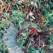 bestehend aus Blumengestecken, Laub und kleinen Mengen an Kehrgut, Blumenerde und Grabkerzen etc.